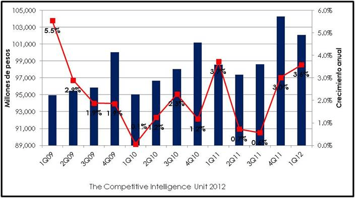 Durante el primer trimestre de 2012, la economía mexicana continuó su trayectoria de expansión observable desde 2011, al registrar una tasa de crecimiento anual de 4%, lo que creó un ambiente favorable para principios del 2012. El crecimiento se ha sustentado tanto en la demanda interna como en la externa, junto con estabilidad de precios. Por su parte, se observó un crecimiento positivo en el consumo y la inversión, sustentado principalmente por la expansión del empleo formal y el otorgamiento de crédito, que derivó en una mayor confianza tanto de los productores como de los consumidores.