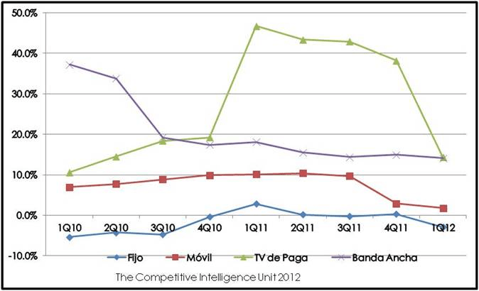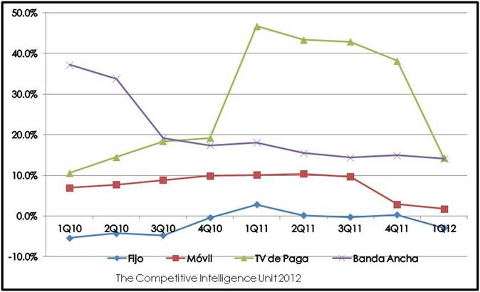 Al analizar el crecimiento en el número de suscriptores de cada segmento al interior del sector, es posible observar el mayor dinamismo en el segmento de TV de paga, que mostró un crecimiento anual por encima de 40% durante 2011, aunque muestra señales de estabilización durante el primer trimestre de 2012, creciendo 14.3% respecto al 1Q11. Con ello, la TV de paga sumó 12.4 millones de suscriptores, valor que representa una penetración de 10.8%.