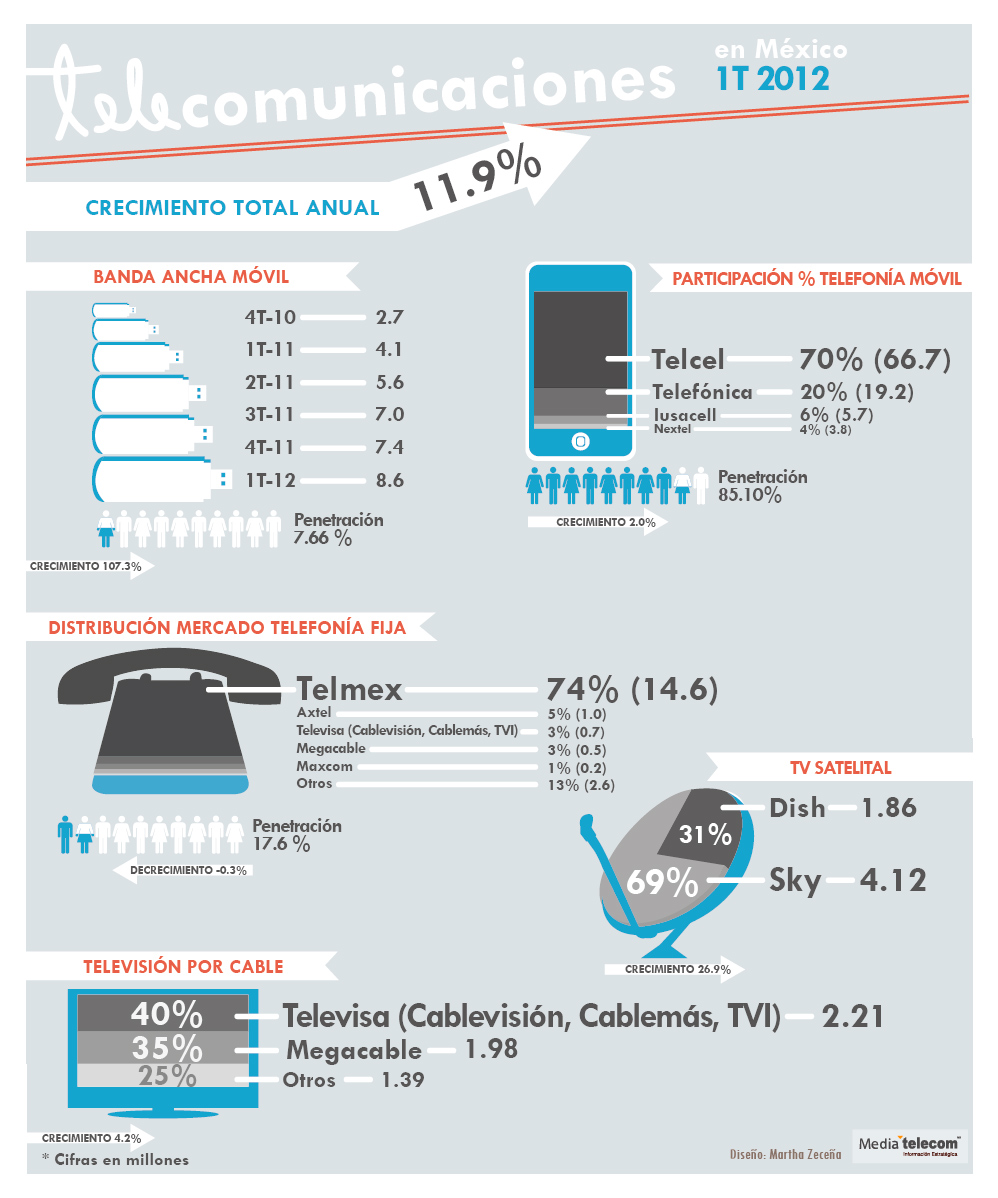 En su conjunto, el sector de las telecomunicaciones en México mostró un crecimiento de 11.9 por ciento durante el primer trimestre del 2012, impulsado nuevamente por el ritmo de avance que desde hace algunos años presentan la televisión de paga, en especial la satelital, y el tráfico en las redes de telefonía móvil. Un dato a destacar durante el presente estudio es la inclusión de accesos de banda ancha móvil, que por primera vez se presenta como un dato oficial dentro de los reportes del sector realizados por la Comisión Federal de Telecomunicaciones (Cofetel), aunque también resalta la ausencia de datos de Internet fijo.