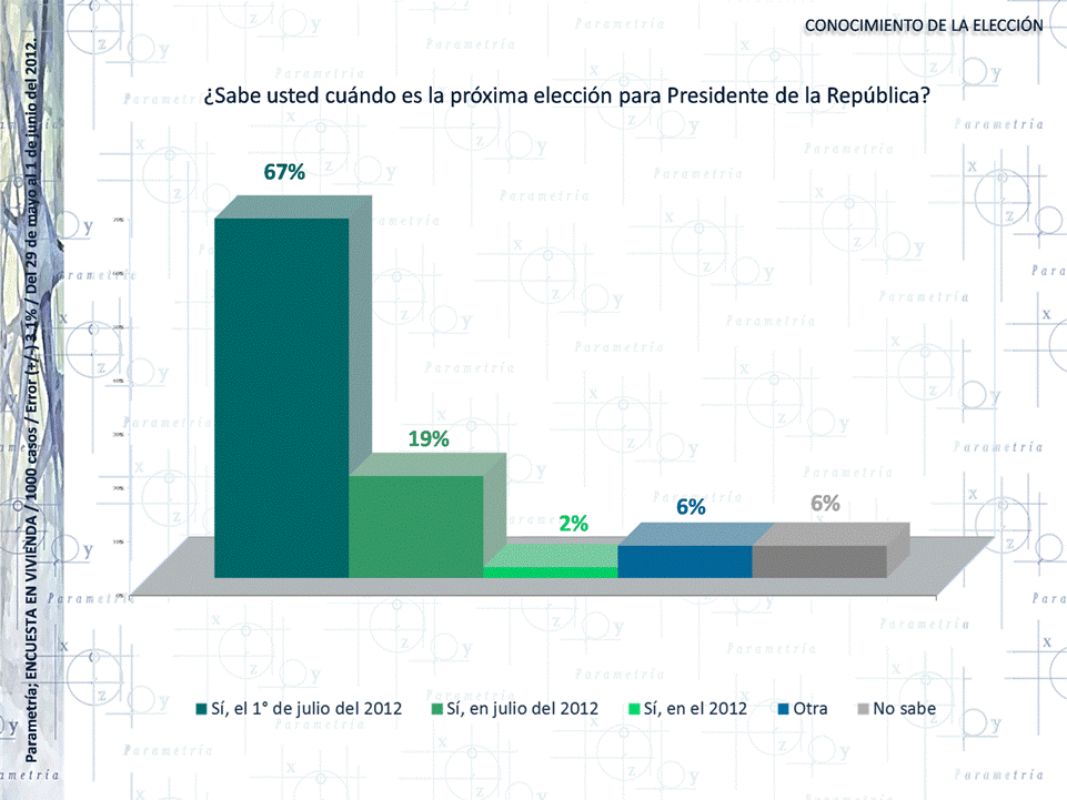 A menos de un mes de la votación para Presidente de la República, siete de cada diez mexicanos (67%) conocen la fecha exacta de la jornada electoral, mientras que un 19% sabe que será en julio cuando se elija al próximo Ejecutivo federal, 2% sabe únicamente que será este año la elección