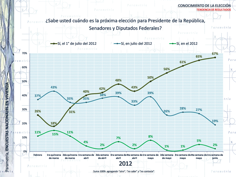 El histórico de Parametría permite ver que de febrero a la fecha se ha incrementado en 40 puntos el porcentaje de personas que conocen con exactitud la fecha de la elección. La medición de esta variable resulta particularmente importante porque indica el interés de los ciudadanos en la elección y con ello la disposición para ir a votar.