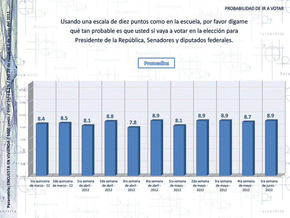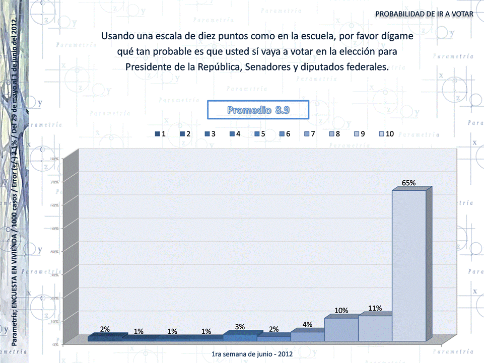 Cuando se pregunta a los ciudadanos por la probabilidad de ir a votar el próximo 1 de julio -usando una escala de 1 al 10-, se obtiene un promedio de 8.9, más cercano a la seguridad de asistir a las urnas en la jornada comicial. De hecho, la mayor parte de los ciudadanos se concentra en el 10, el punto que representa mayor seguridad para acudir a las urnas, con 65%.