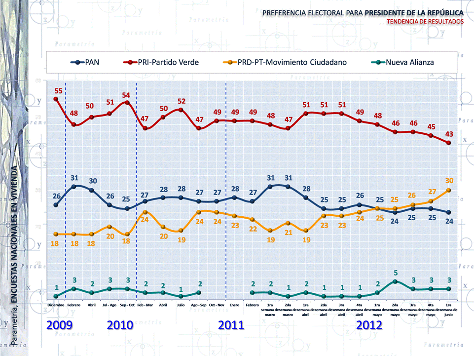 Los datos del levantamiento muestran que Enrique Peña Nieto (PRI-PVEM) encabeza la intención de voto, con 43% de la preferencia electoral efectiva. En segundo lugar está Andrés Manuel López Obrador (PRD-PT-Movimiento Ciudadano) con 30%. La ventaja de Peña sobre el segundo lugar se reduce a 13 puntos, la menor que se registra en la seria de Parametría.