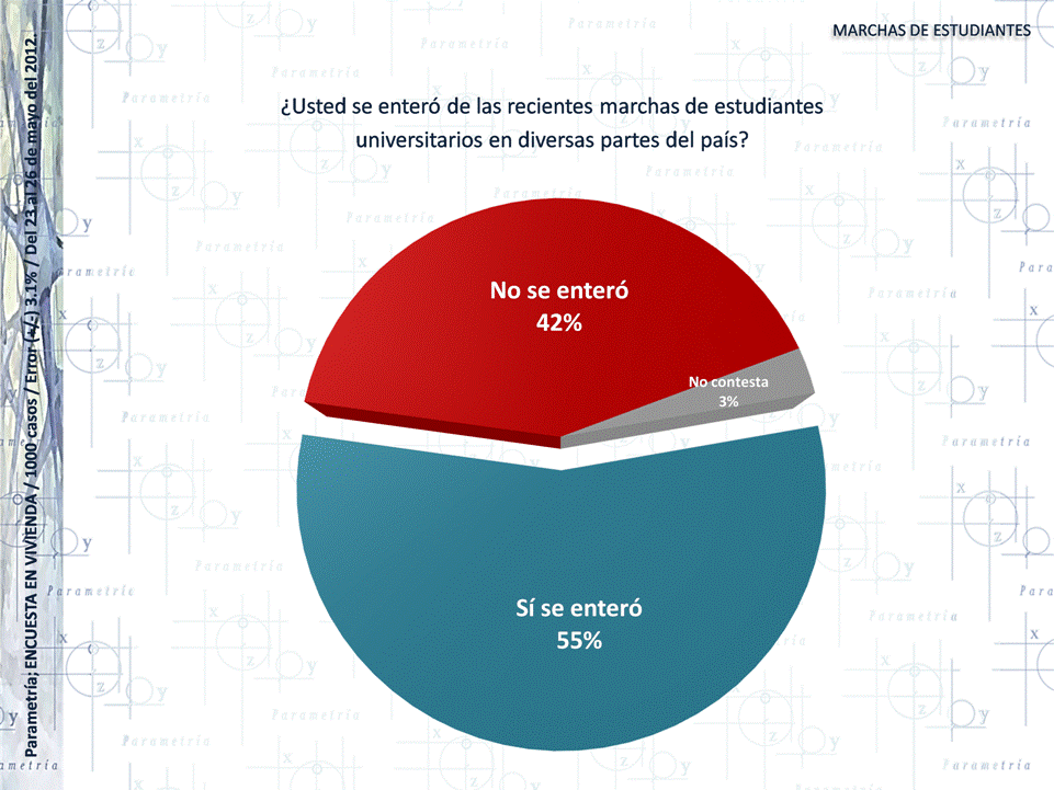 La encuesta de Parametría investigó la opinión de los ciudadanos sobre el movimiento estudiantil #YoSoy132. En el levantamiento del 23 al 25 de mayo, 55% de los encuestados se había enterado de las marchas de estudiantes universitarios en el país.