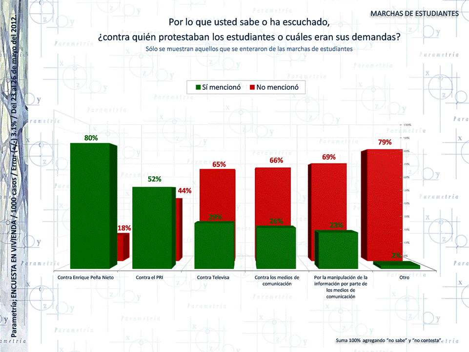 El 29% mencionó a Televisa como objetivo de las protestas y 26% a los medios de comunicación. Además un 23% consideró que los manifestantes se pronunciaron en contra de la manipulación de los medios de comunicación a la información.
