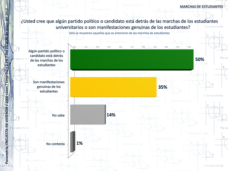 La mitad de quienes conocen del movimiento, declarado apartidista, considera que algún partido político o candidato está detras de las manifestaciones. Más de un tercio opina que se trata, en efecto, de manifestaciones genuinamente estudiantiles.