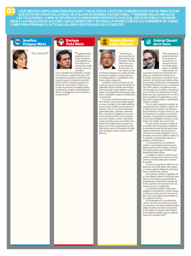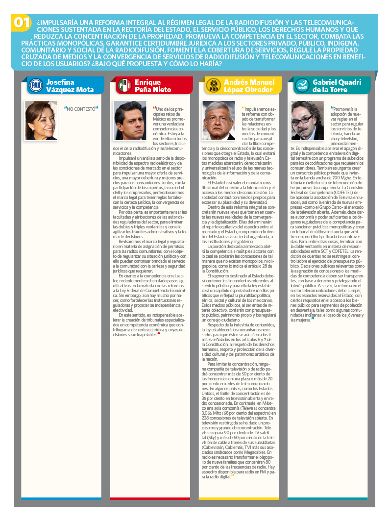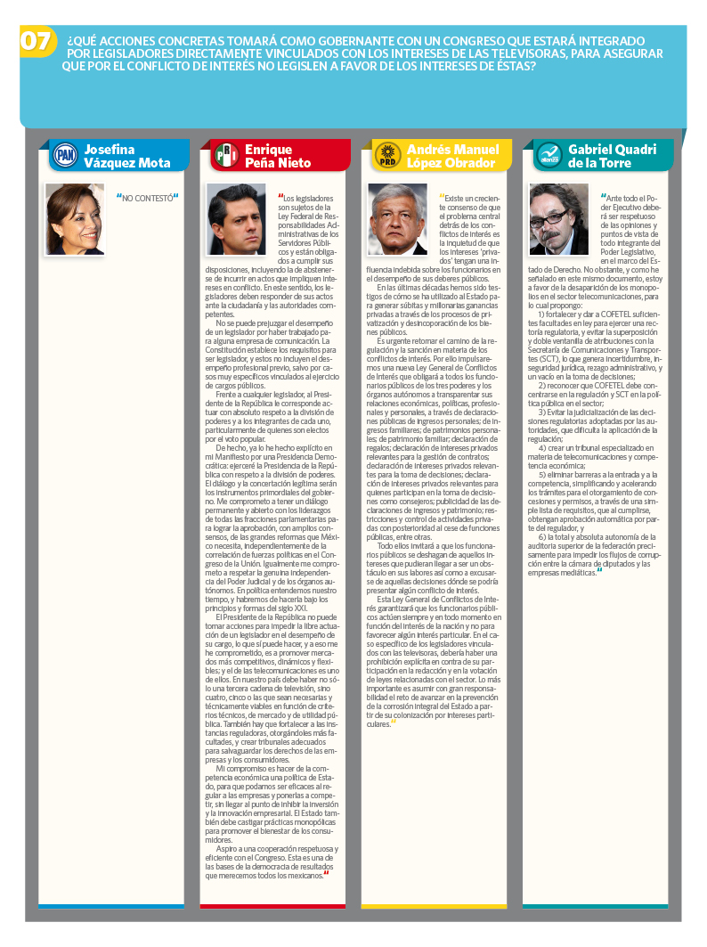 Enviamos por este medio un comparativo de las respuestas que los candidatos dieron a las primeras preguntas de la Coalición, el total de ellas también las pueden consultar en la página electrónica http://www.telecracia.org; son las que debieran cumplir mínimamente en caso de llegar a la Presidencia de la República. Como Coalición Ciudadana exigiremos que se cumplan.