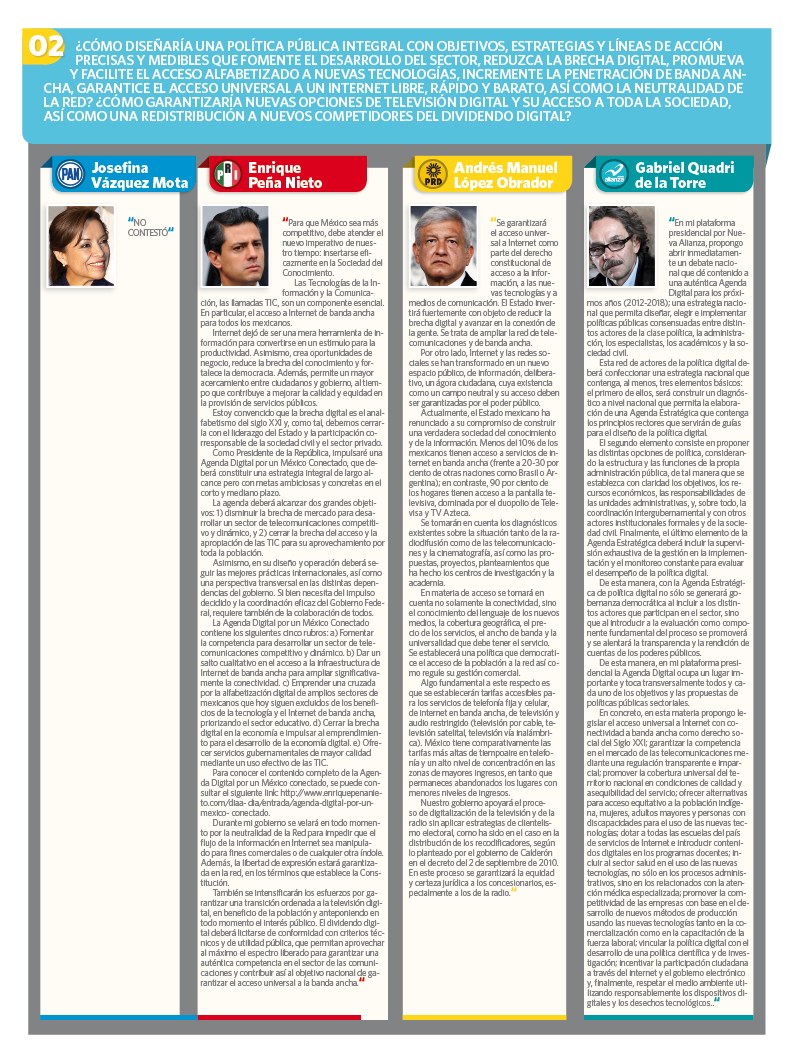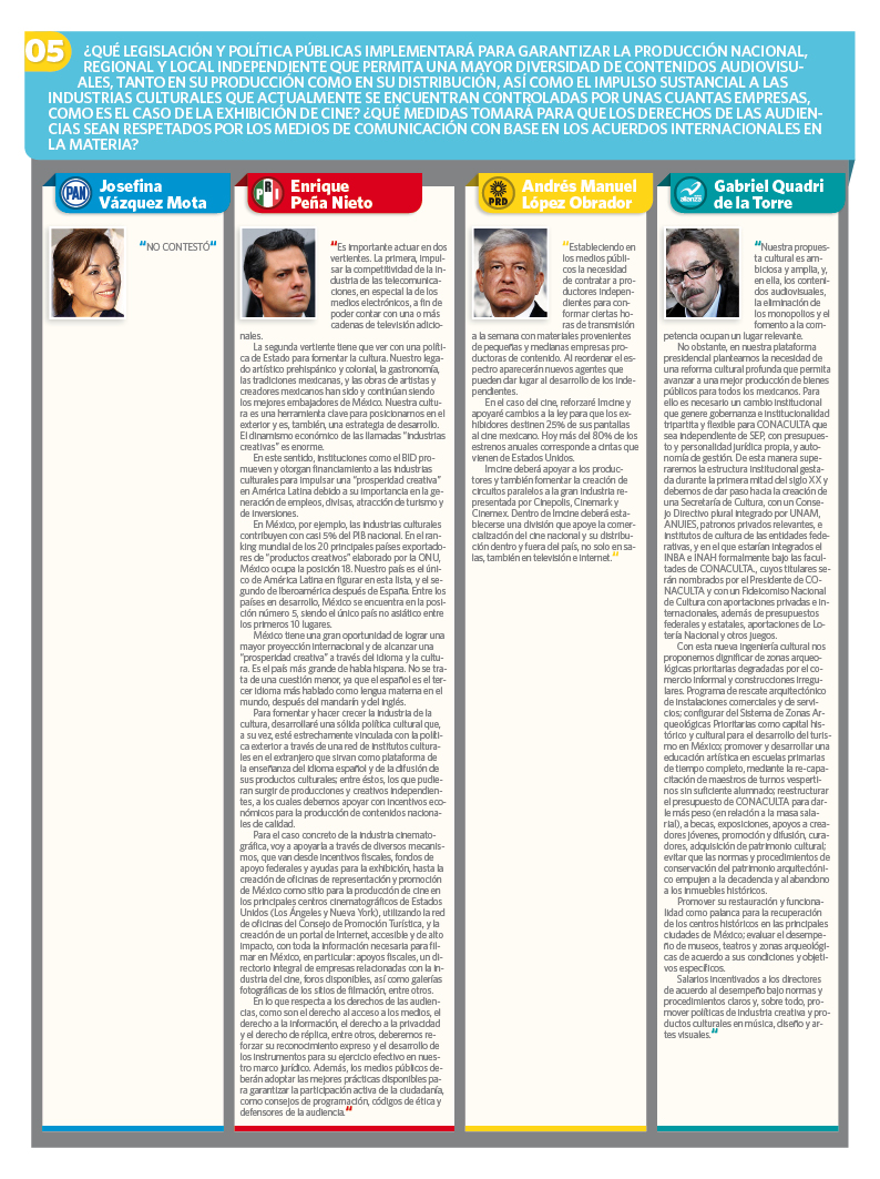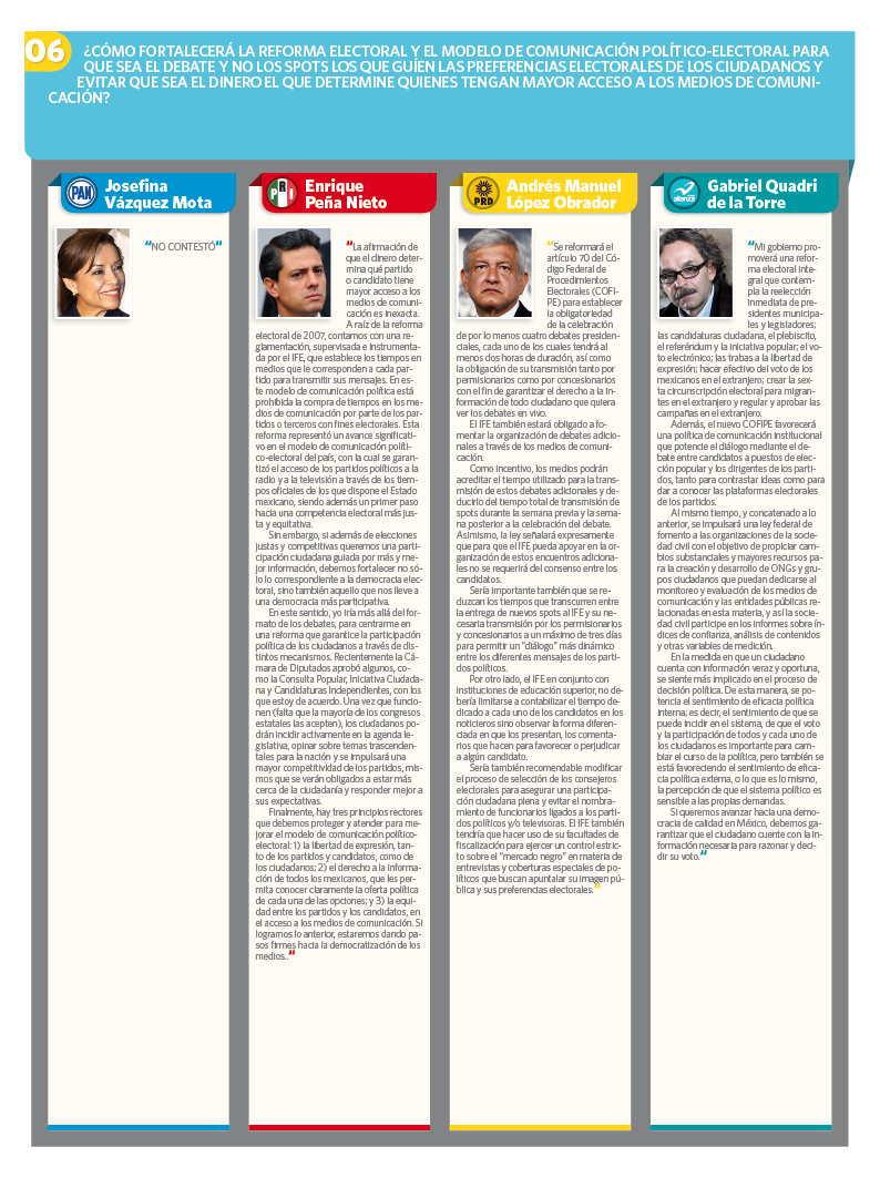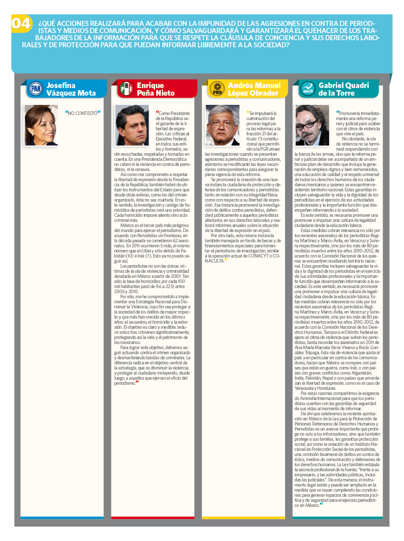 Tal como lo hemos dado a conocer a través de la página electrónica y de las redes sociales, el pasado 4 de junio recibimos las respuestas de los candidatos a la Presidencia de la República a las siete preguntas sobre la agenda del Derecho a la Información. La candidata Josefina Vázquez Mota del PAN no atendió a nuestras preguntas y sólo aprovechó la inclusión de nuestra dirección electrónica para mandarnos propaganda de su campaña.