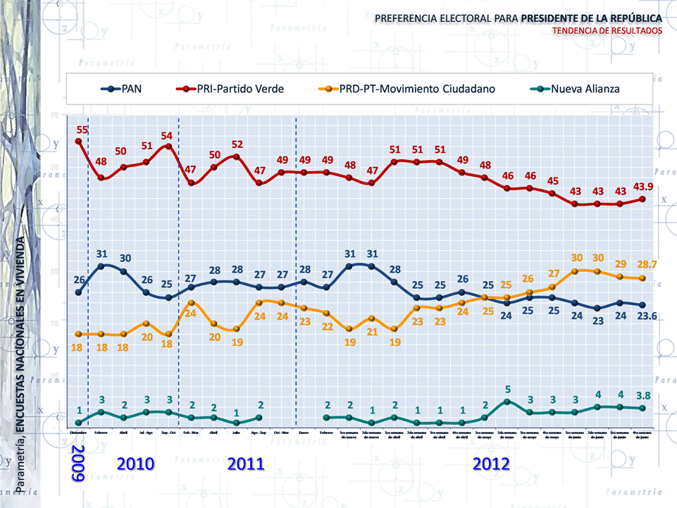 Le sigue, con 28.7%, Andrés Manuel López Obrador, candidato de la Coalición Movimiento Progresista, de los partidos PRD, PT y MC. En tercer lugar, con poco más de 5 puntos atrás (23.6%), está Josefina Vázquez Mota, candidata del PAN.