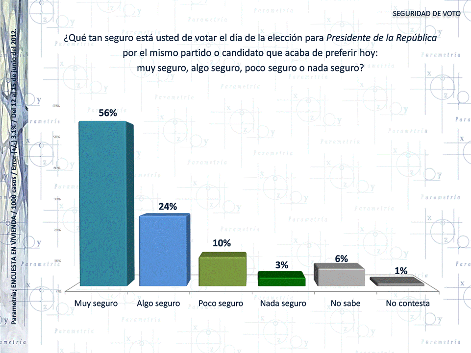 En la encuesta levantada del 12 al 15 de junio por Parametría encontró que de los encuestados que declaraban alguna preferencia electoral, el 56% consideraba muy seguro votar el 1 de julio por la opción elegida en la encuesta, y un 24% creía algo seguro esa posibilidad.