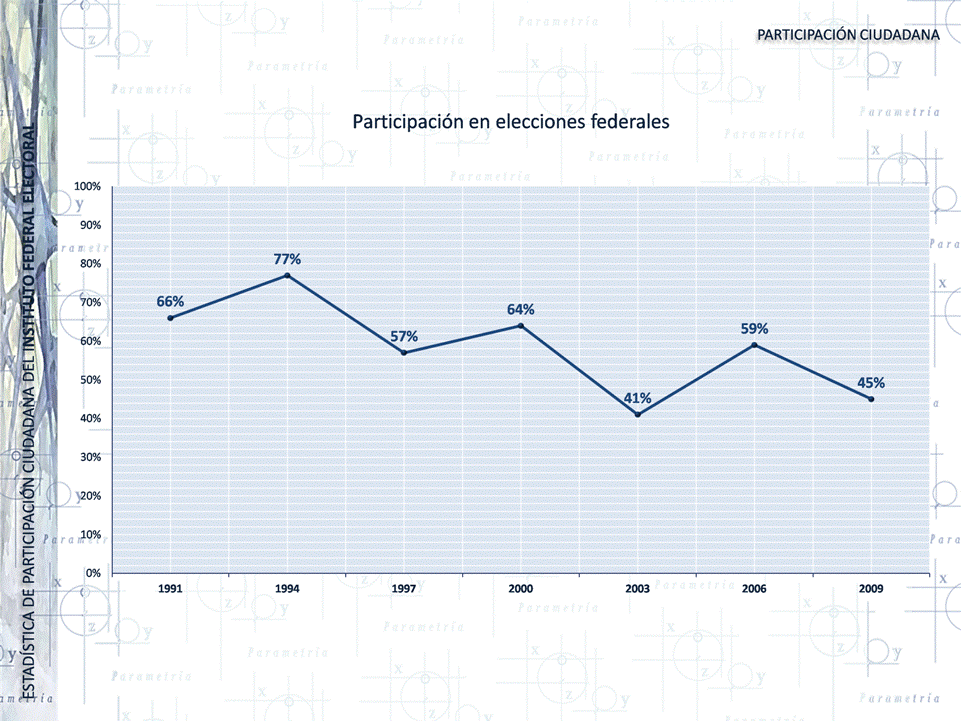 De acuerdo con datos del Instituto Federal Electoral, la participación en elecciones presidenciales ha caído de 77% en 1994 a 59% en 2006. El histórico permite observar que en las elecciones federales intermedias (donde únicamente se vota para elegir diputados federales), la participación aunque menor, tuvo un incremento de cuatro puntos del 2003 al 2009.