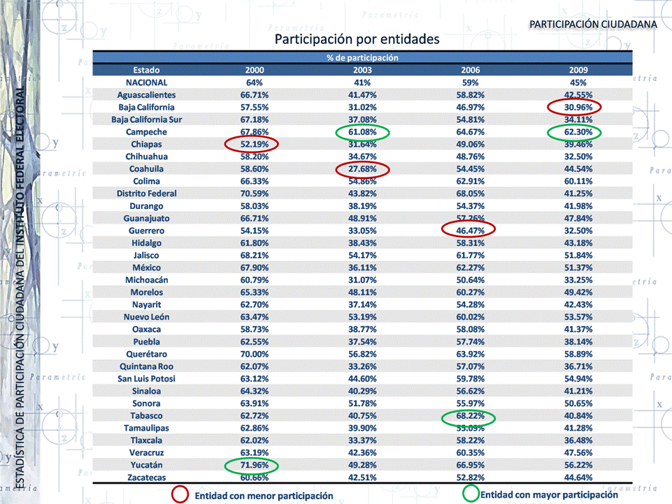 Al revisar los números por entidades se aprecia que Campeche es una de las más participativas (la más en las elecciones intermedias de 2003 y 2009). Mientras que Baja California es en las que se aprecia mayor abstencionismo.