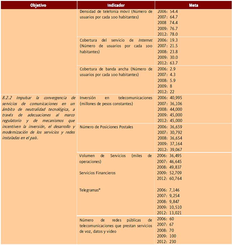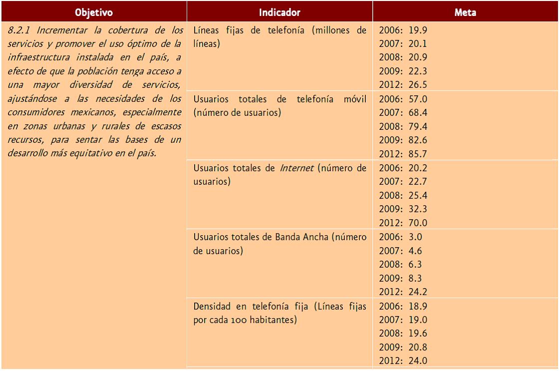 Como se observa de la tabla anterior, diversos objetivos planteados a inicios del sexenio (2007) difícilmente se cumplirán, salvo por la telefonía móvil, que más por verse beneficiada por un programa sectorial, ha experimentado un crecimiento inercial como el que se observa en prácticamente todo el mundo. Cabe señalar que la mayoría de los países de América Latina ya han rebasado el 100 por ciento de penetración, por lo que no se puede celebrar el nivel actual de cobertura de telefonía móvil en México, sino que simplemente el objetivo se quedó corto ante el significativo avance de este mercado en comparación con otras partes del mundo.