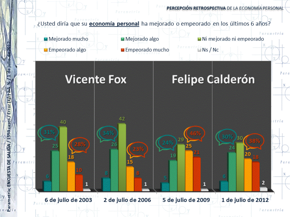 Para julio de 2012 en el gobierno de Calderón, un 38% mencionó que su economía personal había empeorado contra un 30% que vio mejoría en el último sexenio. Se observa un aumento de 15 puntos porcentuales en la opinión negativa de la economía personal de un gobierno panista a otro.
