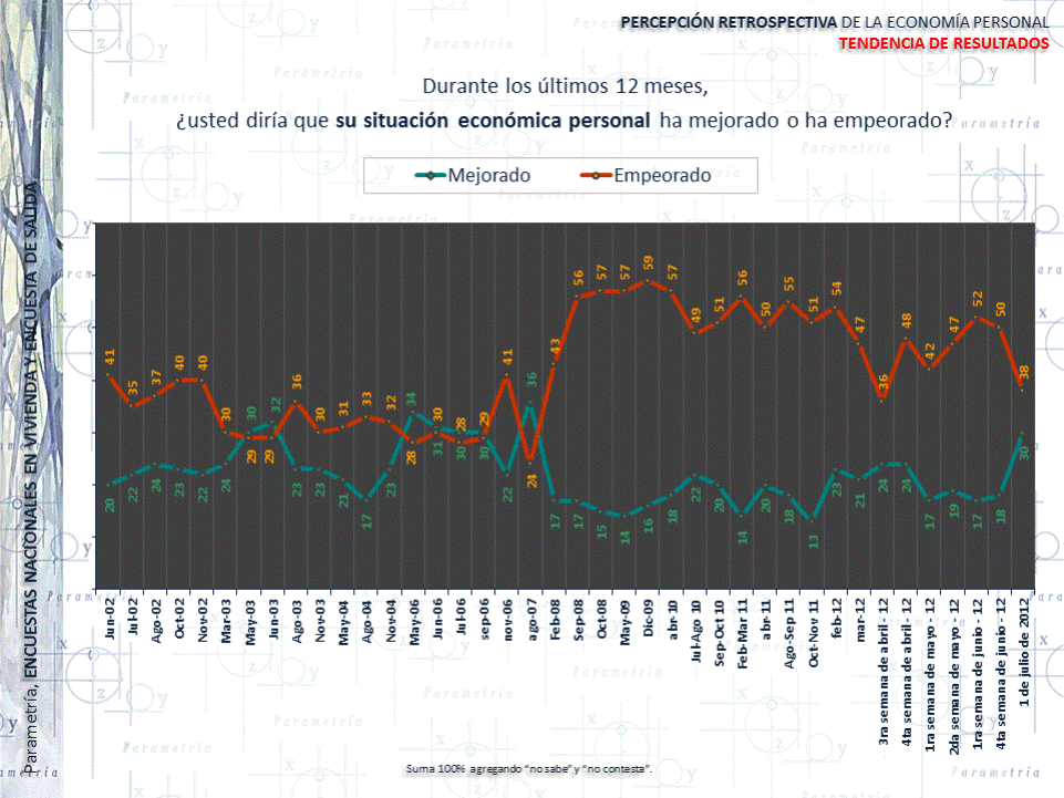 De acuerdo con la serie histórica (2003-2012), desde febrero de 2008 hay un mayor número de mexicanos que consideran que su económica personal ha empeorado, con porcentajes que van desde del 36% al 59%. Si bien el porcentaje de aquellos que perciben una peor situación económica personal es siempre mayor, en julio del presente año se observa un cierre significativo en la brecha de opinión, con un 38% de mexicanos que mencionan que había empeorado y un 30% que perciben mejoras.