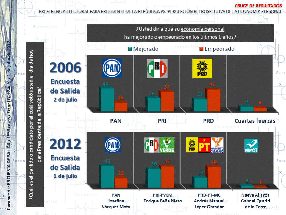 En 2012 el 42% que dijo que su economía persona había mejorado votó por Acción Nacional, y el voto de los que dijeron que se había agravado fue en 41% por la Alianza PRI-PVEM y 40% para Movimiento Progresista.
