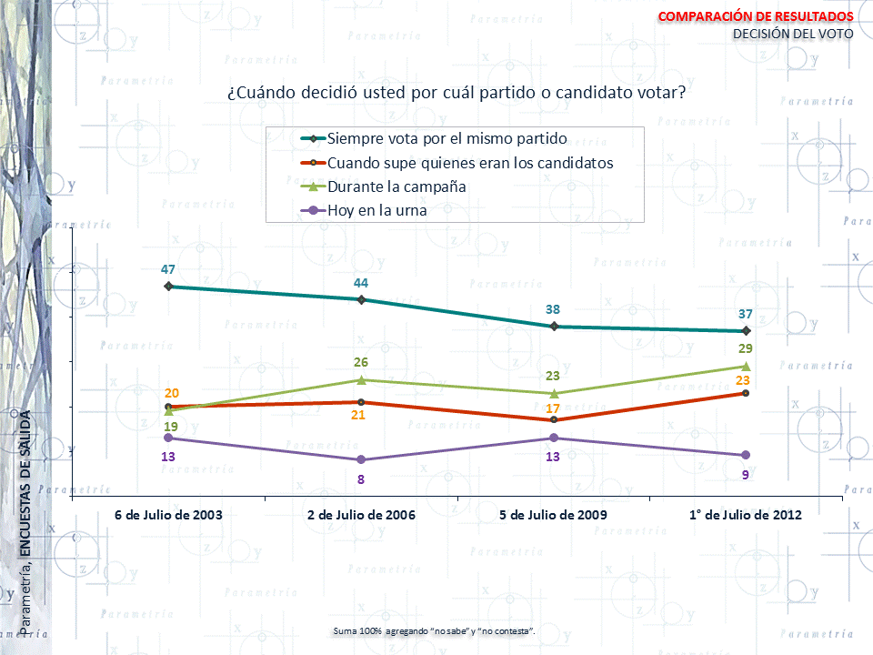 Lo mismo sucedió con aquellos votantes que toman su decisión basados en lo que ven y escuchan en las campañas, ya que la proporción de individuos que decidieron su voto durante la campaña pasó de 19% en 2003 a 29% en 2012.