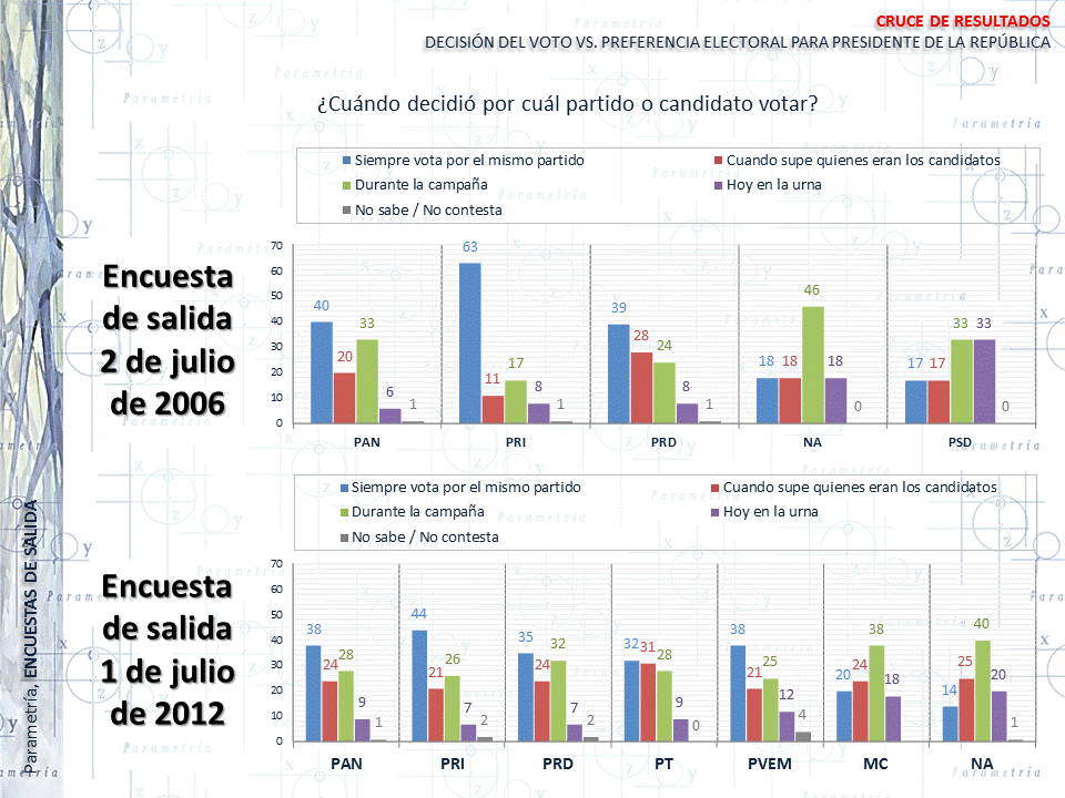 Comparando las encuestas de salida de 2006 y 2012, se observa que de los tres principales partidos en México, el PRI es el que presenta un mayor descenso en el porcentaje de votantes que emiten su voto basados en la tradición, pues registra 19% menos electores que siempre votan por ese partido.