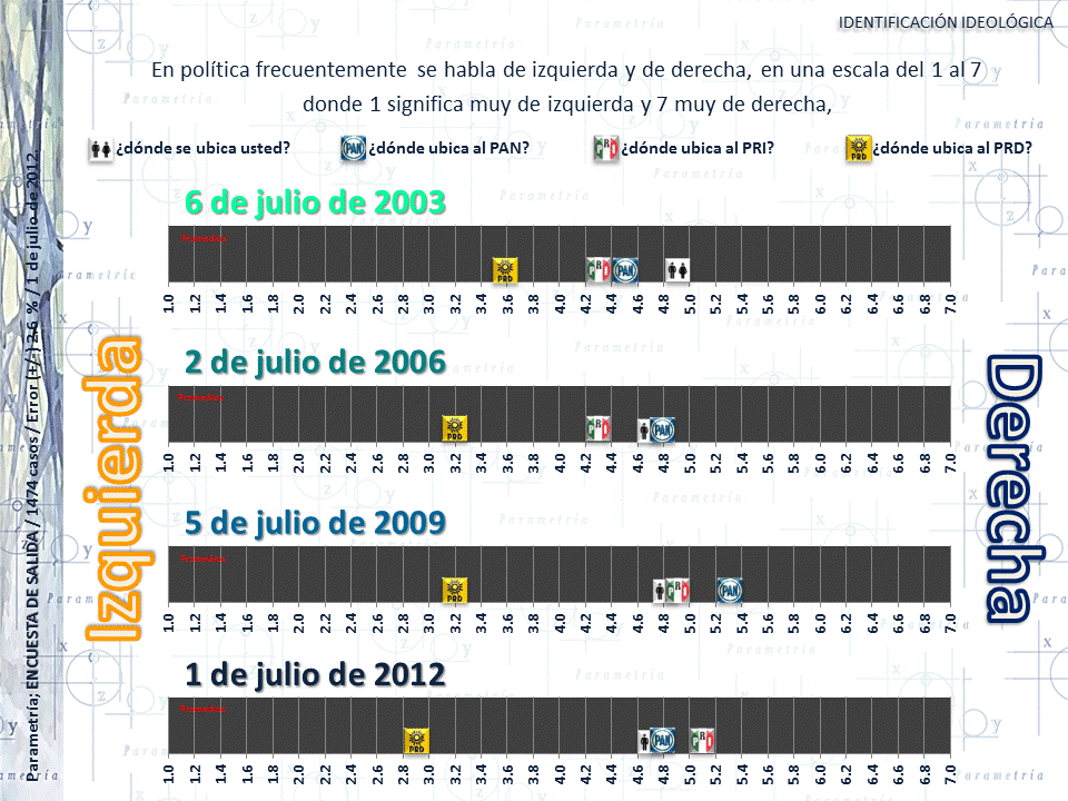 Desde la percepción del votante, de 2006 a 2012 el PAN se acercó aún más al elector, el Partido Revolucionario Institucional se movió a la derecha de manera significativa y el PRD recorrió algunos puntos a la izquierda, los electores no identifican a ningún partido o incluso a ellos mismos en el centro de la escala.