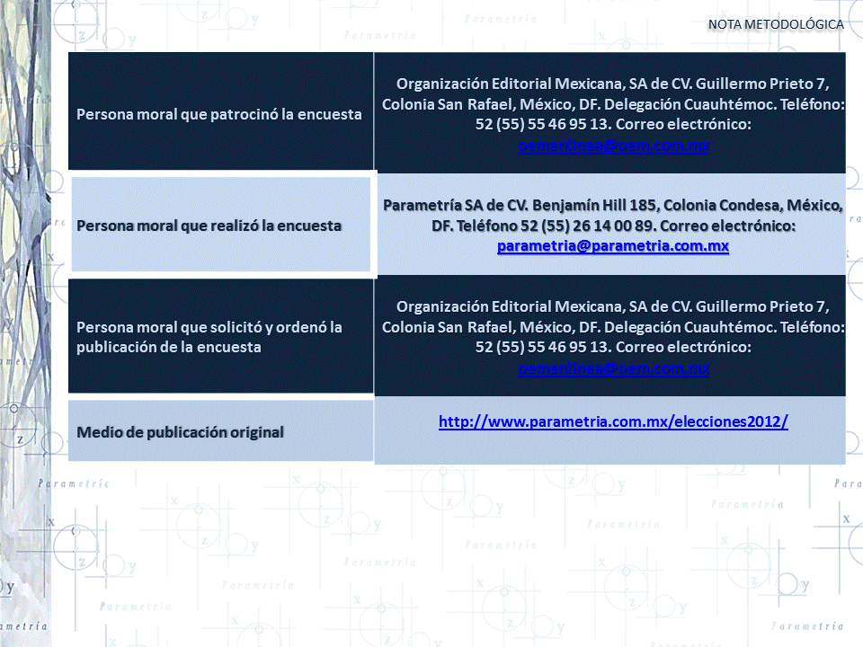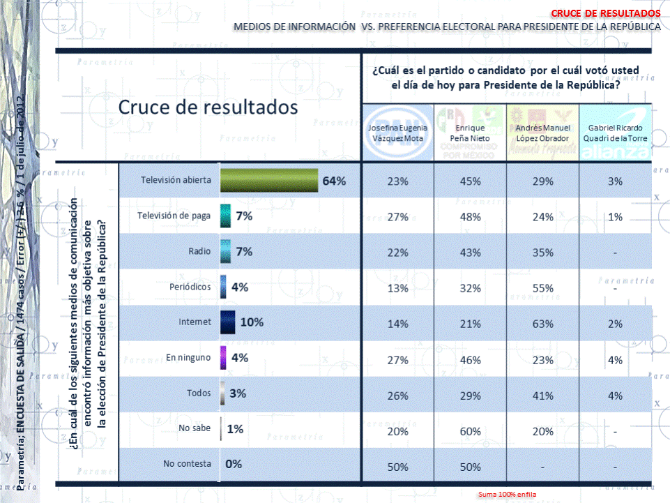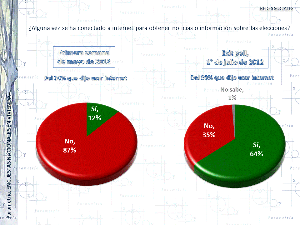 En la encuesta nacional en vivienda de Parametría de mayo de 2012, sólo el 12% de los electores usuarios de internet había obtenido información relacionada con el proceso electoral por ese medio, a diferencia de ello, en la encuesta de salida realizada el 01 de julio, el 64% de los votantes usuarios de internet dijeron haber ingresado a la red para obtener información sobre los comicios. Es decir, hubo un incremento de 52 puntos en dos meses.