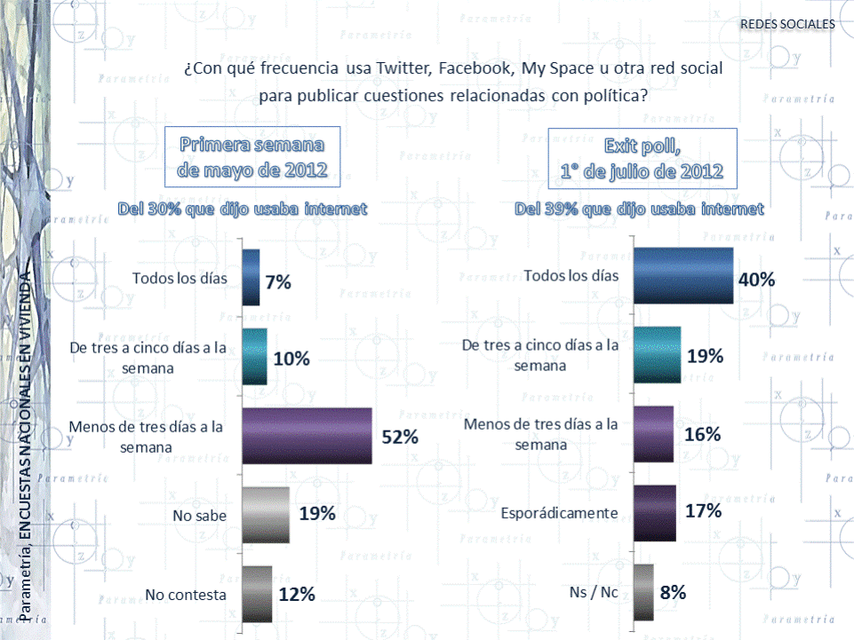 Otro dato contrastante, es el uso que se dio a la redes sociales, de aquellos votantes que utilizaron internet, un 40% dijo haber publicado todos los días en alguna red social (twitter, facebook, my space) cuestiones relacionadas con política, en la encuesta de mayo de 2012, la mayoría de entrevistados (52%) refirió hacer publicaciones en menos ocasiones (menos de tres días a la semana), sólo un 7% dijo hacerlo diariamente.