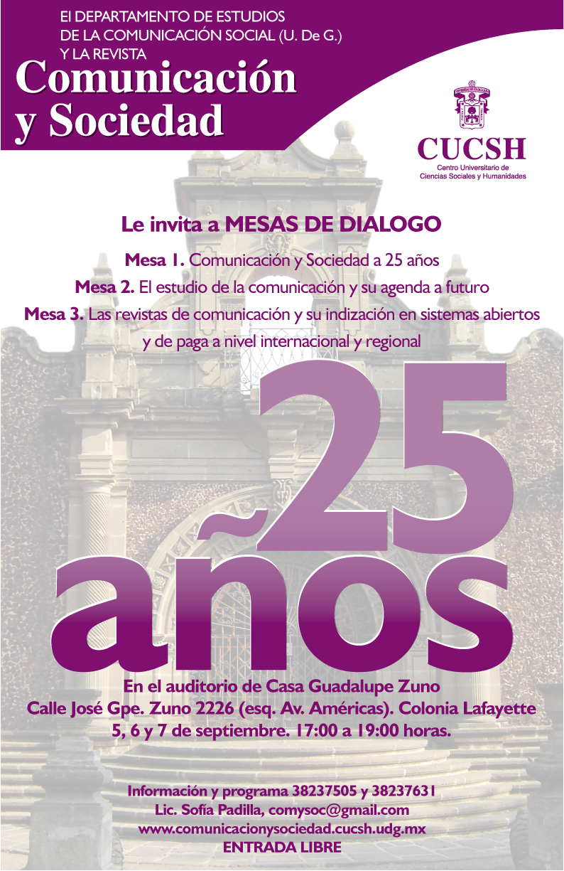 Por medio de la presente, nos complace invitarlos a las Mesas de Diálogo con motivo del XXV Aniversario de la Revista Comunicación y Sociedad el 5, 6 y 7 de septiembre a las 17:00 hrs. en el auditorio de la casa Guadalupe Zuno. En adjunto, les enviamos la invitación así como el programa de los festejos.