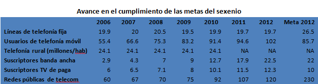Telefonía móvil. El gobierno también alcanzó sus modestas metas en telefonía móvil, al registrar 97.6 millones de accesos al segundo trimestre y esperar cerrar el año con 102 millones, en contraste con los 85.7 millones de líneas móviles que programó al inicio de la administración. La densidad de telefonía móvil a 2012 se ubicó en 86.9 por ciento.