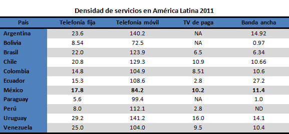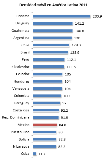 Sin embargo, a pesar de haber superado la meta inicial, la densidad sigue siendo insuficiente en comparación con los demás países de América Latina. Como se observa en la gráfica, por encima de México existían en 2011 15 países de la región que tienen mayor penetración de telefonía móvil. México sólo supera a Cuba, Nicaragua, Bolivia y Puerto Rico, y se ubica entre algunos de los países más pobres y con menor ingreso per cápita y nivel de desarrollo en la región.
