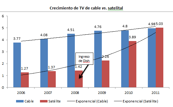 De 2007 a 2011 el número de suscriptores por cada 100 habitantes en la televisión de cable pasó de 4.08 a 4.98, es decir, ni siquiera en cuatro años los cableros lograron incrementar la cobertura del servicio para un nuevo suscriptor más en el conjunto de la población. En cambio, durante el mismo periodo, la televisión satelital pasó de 1.36 suscripciones por cada 100 habitantes en 2007 a 5.03 suscripciones en 2011. El crecimiento fue notable.