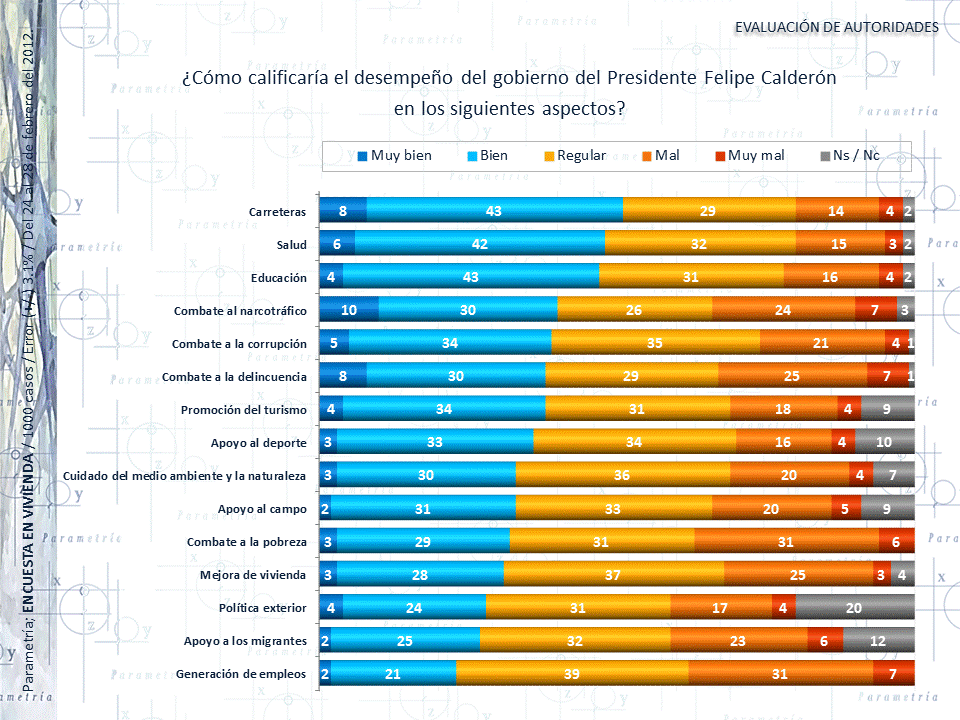 PARAMETRÍA. Encuesta Nacional en vivienda. Representatividad: Nacional. Número de entrevistas: 1000 encuestas del 24 al 28 de febrero de 2012. Nivel de confianza estadística: 95%. Margen de error: (+/-) 3.1%. Diseño, muestreo, operativo de campo y análisis: Parametría SA de CV. Método de muestreo: Aleatorio sistemático con probabilidad proporcional al tamaño. Unidad de muestreo: Las secciones electorales reportadas por el IFE. Población objetivo: Personas de 18 años en adelante con credencial para votar que al momento de la entrevista residan en el lugar de interés.