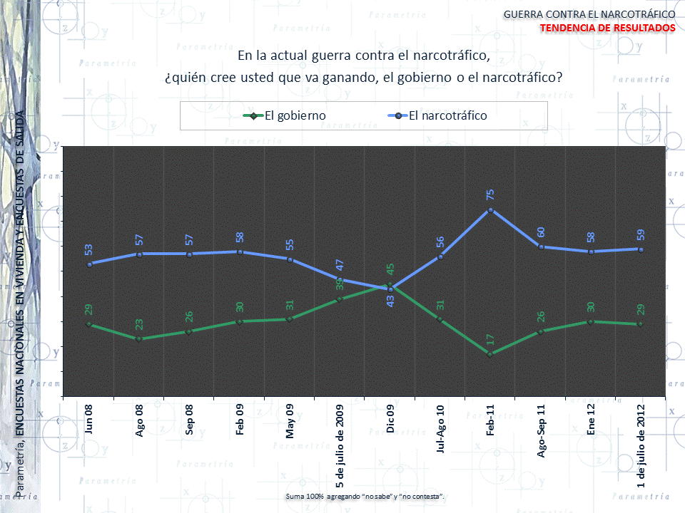 En diciembre de 2009 aumentó 12 puntos la opinión respecto a que el gobierno era el ganador en la lucha contra el narcotráfico, dato que se explica posiblemente por la captura de algunos capos y por la muerte de Arturo Beltrán Leyva, líder del cártel de los hermanos Beltrán Leyva.