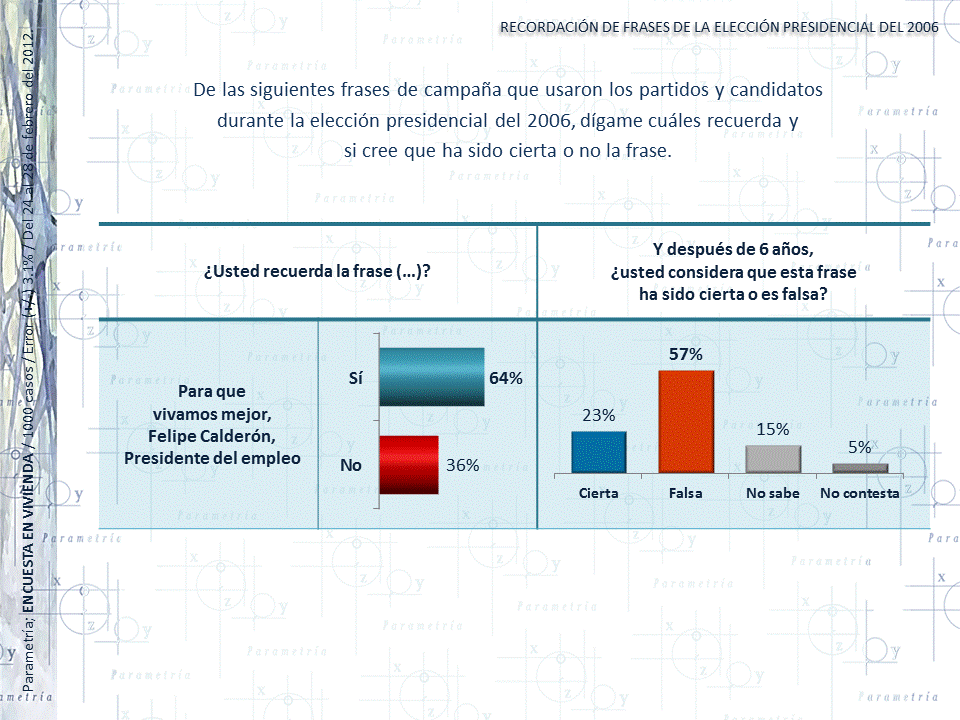 Seis de cada diez entrevistados recuerda la frase usada en la campaña presidencial de 2006 “Para que vivamos mejor, Felipe Calderón Presidente del empleo”, para la mayoría (57%) esa frase resultó falsa después de seis años.