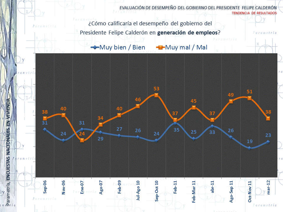 Una de las promesas de campaña de Calderón fue la de crear una economía competitiva generadora de empleos. Sin embargo, este es uno de los rubros donde el mandatario obtuvo baja calificación. Sólo 23% de los entrevistados consideró bueno o muy bueno el desempeño del mandatario en el tema de la generación de empleos.