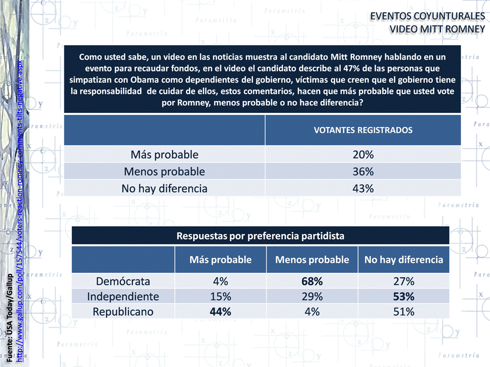 Se dio a conocer un video donde se escucha al candidato Romney describir a la población que apoya a Obama como dependientes del gobierno, victimas que esperan que el gobierno se haga cargo de ellos. De acuerdo con Gallup este evento hizo que la mayoría de los votantes registrados no tuviera diferencia en el voto (43%), sin embargo, el 36% de los votantes registrados dijo que era menos probable que votara por el candidato después de estos comentarios. Entre los votantes demócratas e independientes el evento tuvo un mayor impacto negativo para el candidato Romney (68% y 29% respectivamente)