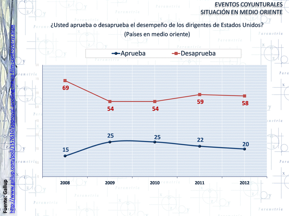 Después de la difusión del video “Innocence of Muslims” inicio una ola de protestas contra Estados Unidos derivando en la muerte del Embajador estadounidense en Trípoli, Christopher Stevens, una de las críticas al gobierno de Obama ha sido la de no imponer políticas de “mano dura” en la región, de acuerdo con un estudio de Gallup en distintas naciones de medio oriente, la mayoría de los encuestados desaprueba el liderazgo de EEUU en la región.