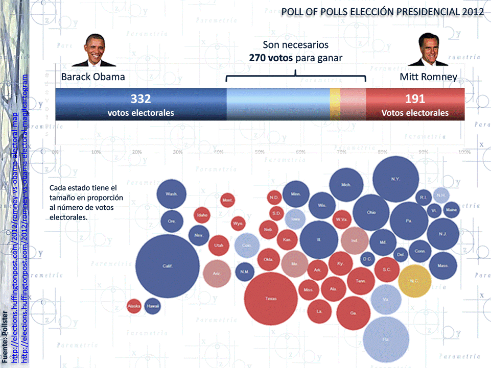 Hay que recordar que en la elección estadounidense se ganan todos los votos electorales de un estado. Existen cinco estados claves en las elecciones de Estados Unidos: Ohio, Florida, Virginia, Colorado, Iowa. De acuerdo con datos de Pollster, en los cinco estados mencionados Obama tiene una preferencia mayor que el candidato Romney.