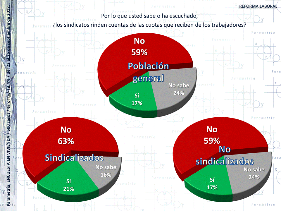 PARAMETRÍA. Encuesta Nacional en vivienda. Representatividad: nacional. Número de entrevistas: 500 encuestas del 22 al 26 de septiembre de 2012. Nivel de confianza estadística: 95% Margen de error: (+/-) 4.4%. Diseño, muestreo, operativo de campo y análisis: Parametría SA de CV. Método de muestreo: aleatorio sistemático con probabilidad proporcional al tamaño. Unidad de muestreo: las secciones electorales reportadas por el IFE. Población objetivo: personas de 18 años en adelante con credencial para votar que al momento de la entrevista residan en el lugar de interés.