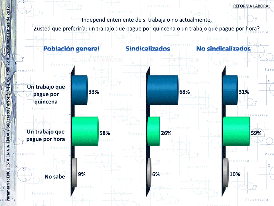 No obstante, la inclinación de la población en general por el pago por horas cambia cuando se pregunta a los trabajadores sindicalizados. Siete de cada diez trabajadores (incorporados a un sindicato), prefiere un trabajo que pague por quincena; contrario a los trabajadores no sindicalizados, quienes en su mayoría optan por un trabajo remunerado por hora.