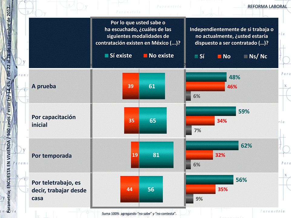 En materia de las nuevas modalidades de contratación, se puede decir que la población en general sabe o ha escuchado de ellas. De igual forma, entre un 48% y 62% de los entrevistados estaría dispuesto a ser contratado bajo cualquiera de estas características. Este nivel de conocimiento y aceptación manifiesta que en la realidad estas formas de contratación ya existen. Es así que con la reforma a la Ley Federal del Trabajo aprobada hace unos días sólo se está formalizando una práctica que los patrones ya estaban manejando desde hace varios años atrás.