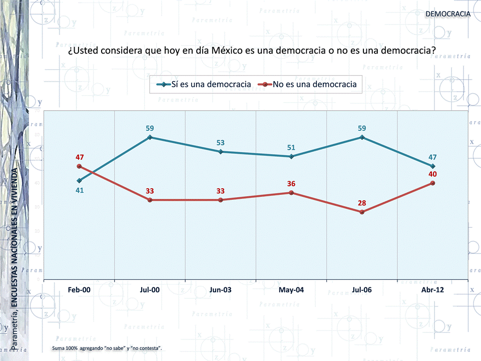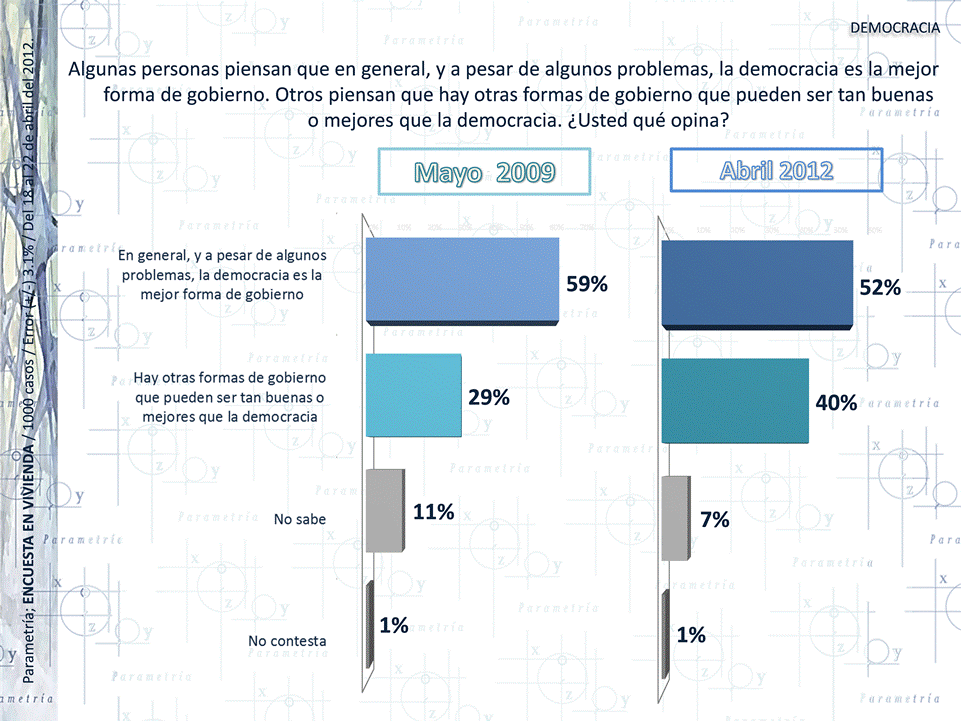 En el caso de México acorde a los datos de la serie histórica de Parametría, se observa que en tres años- de 2009 a 2012- disminuyó en 7 puntos porcentuales, , el número de mexicanos que consideran que, a pesar de algunos problemas, la democracia es la mejor forma de gobierno, pasando del 59% al 52% respectivamente. Aún más relevante, es el aumento significativo de once puntos en aquellas opiniones que consideran que otras formas de gobierno pueden ser buenas o incluso mejores que la democracia (40% en 2012 y 29% en 2009).