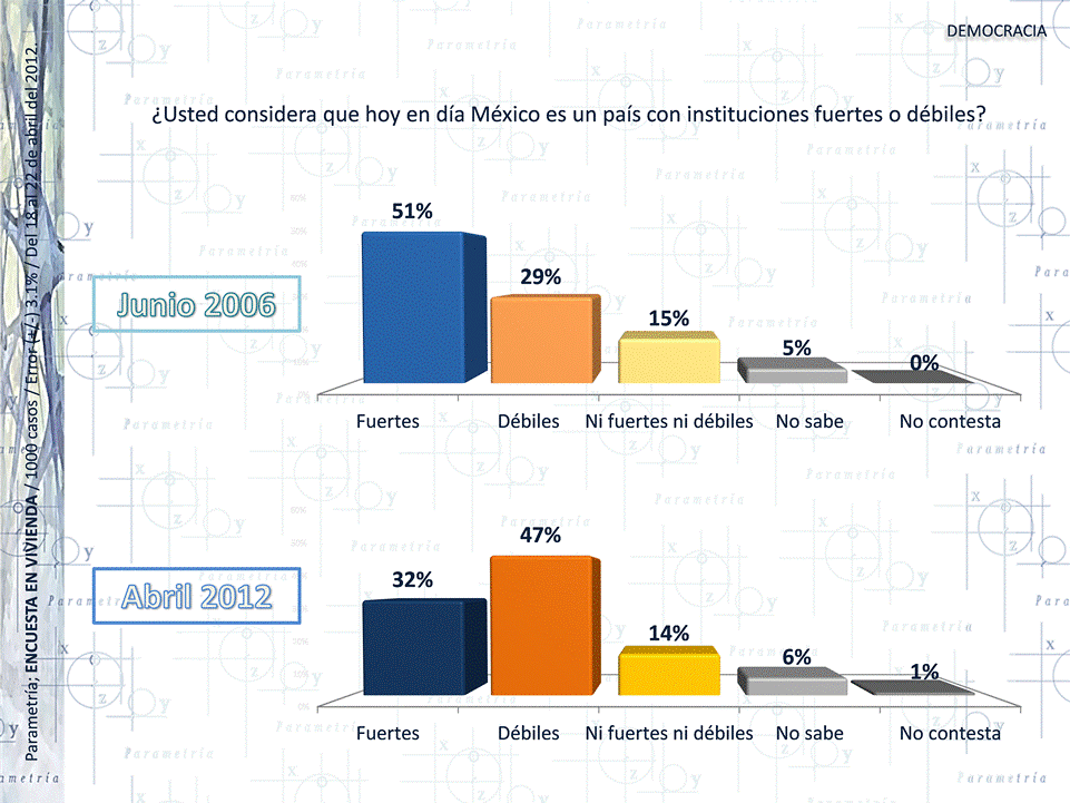 Un actor fundamental dentro del sistema democrático son sus instituciones. De acuerdo con la encuesta de abril de este año, éstas también han sufrido un significativo deterioro en su imagen. En el 2012, el 47% de los mexicanos considera nuestras instituciones como débiles, y si bien el 32% de los mexicanos dijo que México es un país con instituciones fuertes, este porcentaje era mayor al 50% hace 6 años.