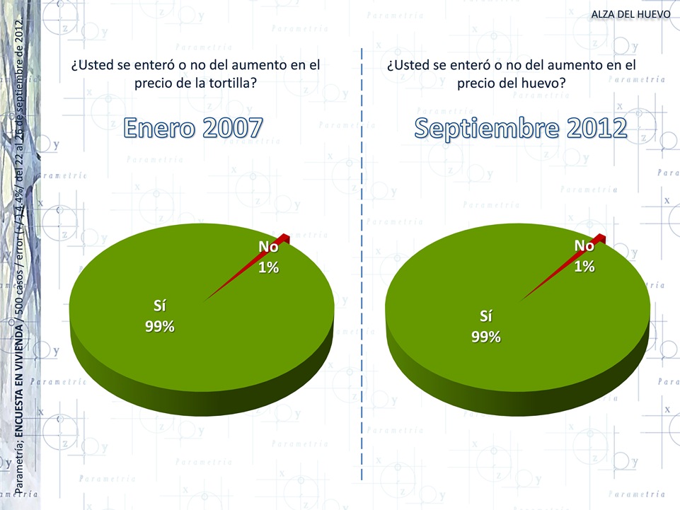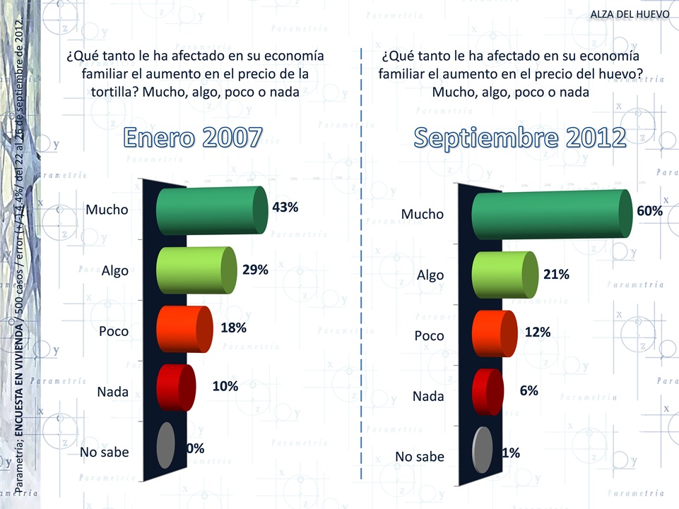 El incremento en el precio del huevo ha afectado mucho más la economía familiar de los mexicanos que el aumento del costo de las tortillas registrado hace 5 años. El 60% de la población afirmó que sus ingresos se han visto mermados por el alza del huevo, diecisiete por ciento más que en enero de 2007 cuando se presentó el incremento en la tortilla.