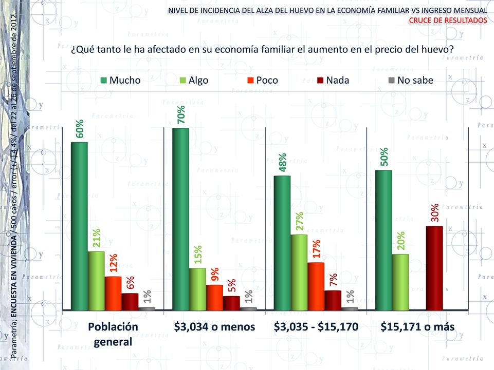 La información de la Encuesta Nacional en vivienda de Parametría, indica que el encarecimiento del huevo ha afectado el poder adquisitivo de las familias mexicanas, sobre todo el de aquellas con menores ingresos. El estrato de la población más perjudicado es el que tiene un ingreso mensual menor o igual a $3,034; el 70% de quienes pertenecen a este grupo indica que le afectó mucho el aumento en el precio del huevo, mientras que en el caso de personas con ingresos mensuales de $ 3,035 o más, el 50% señala haberse visto muy afectado.