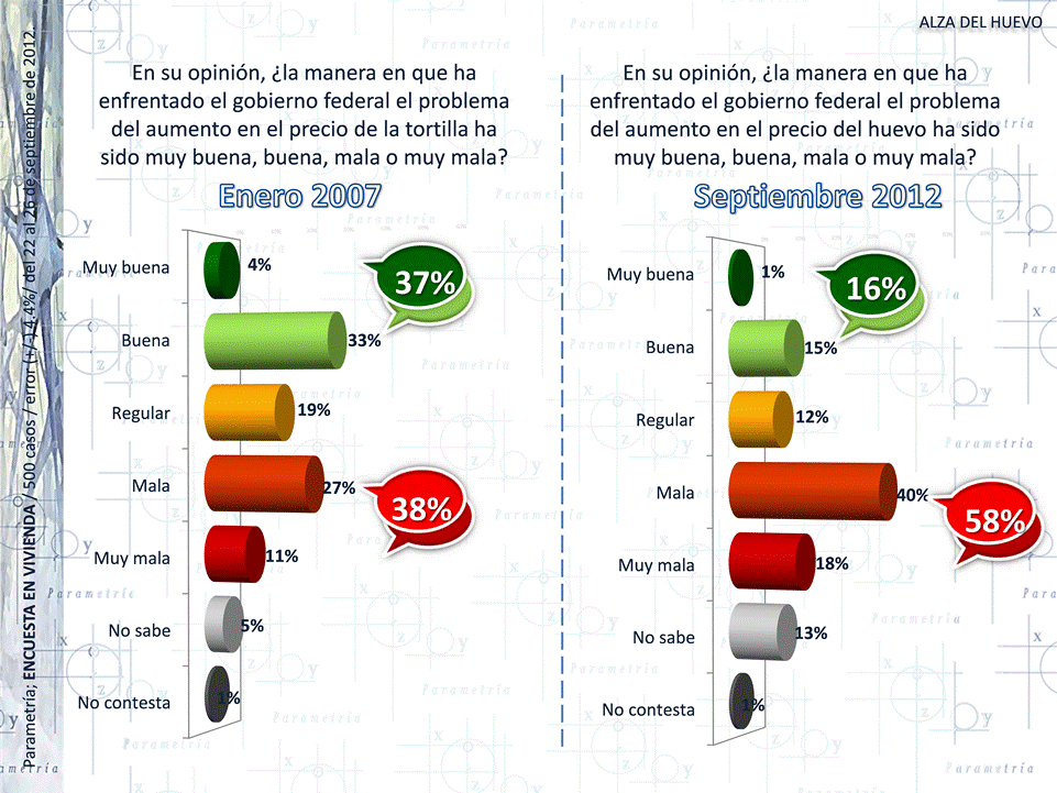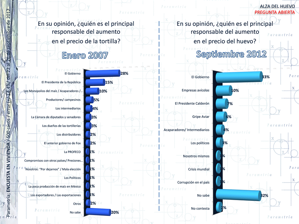 La percepción general de un tercio de la población es que el gobierno es culpable del alza de los costos en alimentos (huevo, tortilla, pollo, carne), y en otros productos de gran consumo (gasolina, luz, gas). Esta apreciación castiga aún más la opinión que se tiene sobre el actuar del gobierno federal ante una escalada de precios. El 58% de los mexicanos reprueba la acción de la administración de Felipe Calderón para enfrentar el problema. El 16% lo califica positivamente y el 12% opina que el trabajo fue regular.