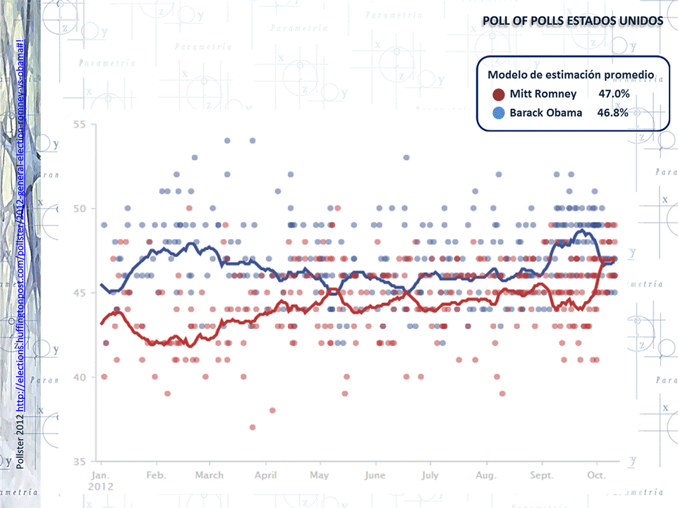 De acuerdo con el sitio de internet Pollster quien hace una recopilación de encuestas sobre preferencia entre los candidatos a la presidencia de EEUU, Mitt Romney y Barack Obama tienen una diferencia de menos de un punto porcentual (47% contra 46.8%)