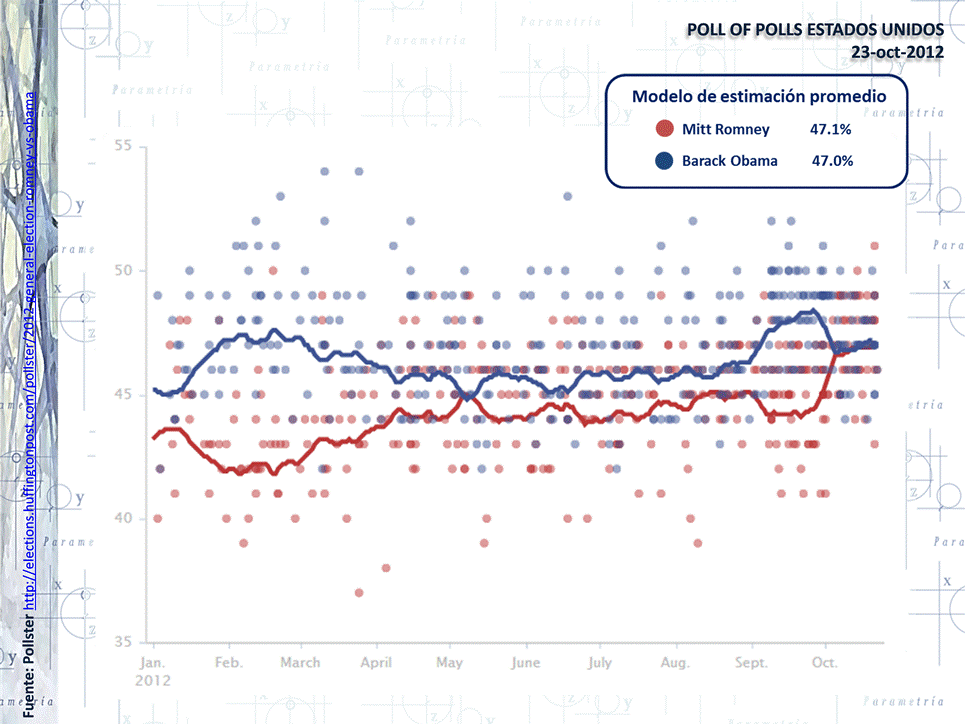 Sin embargo, los datos en Estados Unidos no son tan alentadores en cuanto a la segura reelección del presidente Obama. De acuerdo con el sitio Pollster, el promedio de encuestas realizadas durante el mes da al candidato Romney el 47.1% de la intención de voto frente a un 47% de Obama, derivado de los márgenes de error de los ejercicios estaríamos hablando de un empate técnico entre los contendientes.