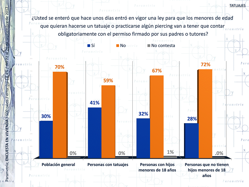 De acuerdo con la encuesta de Parametría, aun después de que entró en vigor, el Reglamento fue poco conocido por la población, apenas tres de cada diez personas se enteraron que por ley los menores de edad que quieran practicarse una perforación o tatuaje tendrán que contar con un permiso firmado por sus padres o tutores. Las personas que cuentan con un tatuaje se enteraron en mayor medida (41%) de las modificaciones al Reglamento.
