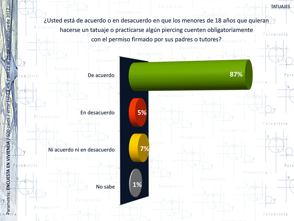 Aun cuando el decreto es desconocido por la población, la mayoría (87%) está de acuerdo con que se exija por ley que los menores de edad tengan un permiso para poder realizarse un tatuaje o perforación, solamente un 5% se manifestó en desacuerdo con la medida.