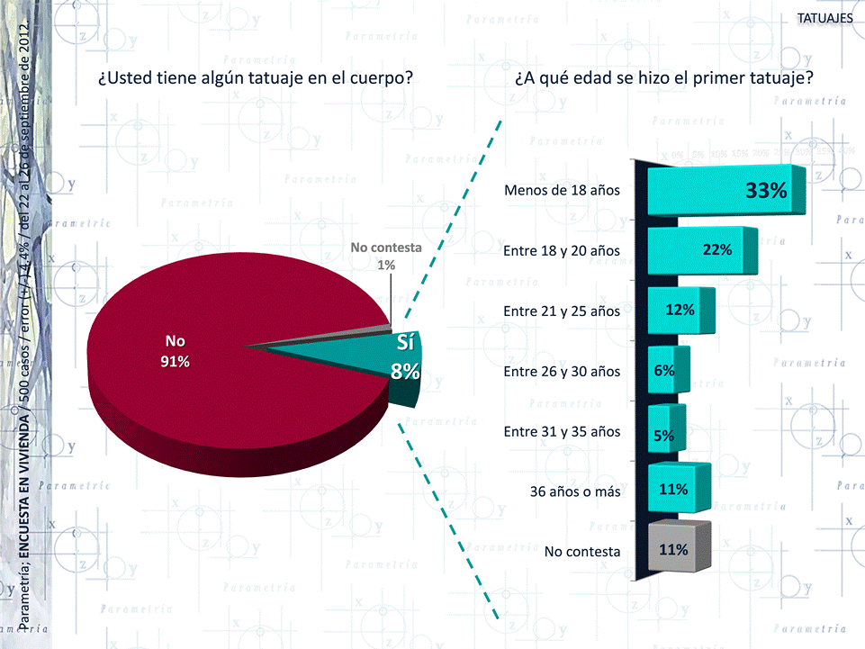De acuerdo con la medición, uno de cada diez mexicanos cuenta con algún tatuaje, de ellos el 33% se lo hizo antes de cumplir la mayoría de edad, 22% entre los 18 y 20 años, y 11% se tatuó después de los 36 años.