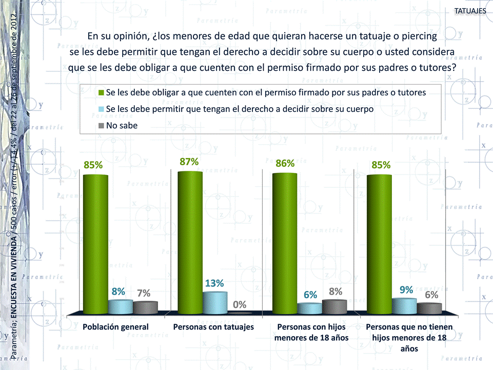 No se observan diferencias significativas entre los diversos grupos en la opinión que apoya el que los menores de edad que quieran realizarse un tatuaje o piercing cuenten con el permiso de sus padres, esta medida es mucho más apoyada incluso sobre el derecho de los menores a decidir sobre su cuerpo, las menciones a favor de la exigencia de permisos oscilan entre 85% y 87%, siendo las personas con tatuajes las que más apoyan lo establecido en el nuevo Reglamento.